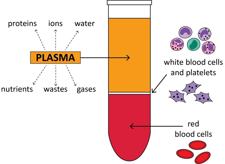 Plasma: The top layer, which is straw-colored, constitutes about 55% of the total blood volume. This liquid component includes water, electrolytes, proteins, hormones, and waste products, serving as the medium for transporting cells and nutrients throughout the body.