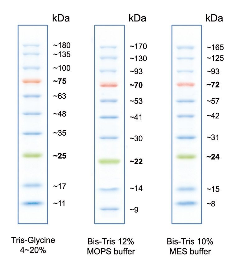 It is worth noting that the pre-stained protein marker is covalently coupled with the dye, so the migration characteristics may change when electrophoresed under different buffer conditions, which may lead to some deviations, so it is not suitable for precise localization of proteins - however, in most cases, the bands on the marker may not be identical to the target protein, and the results we get are just the same as the target protein. However, in most cases, the Marker bands may not be exactly the same as our target protein, and what we get is just a reference size relative to the Marker indication, and in the end, we need Western to characterize it, so if we don't need to distinguish between bands of similar sizes, the pre-stained Marker is still very useful, and it can also be used in conjunction with the unstained protein standard.